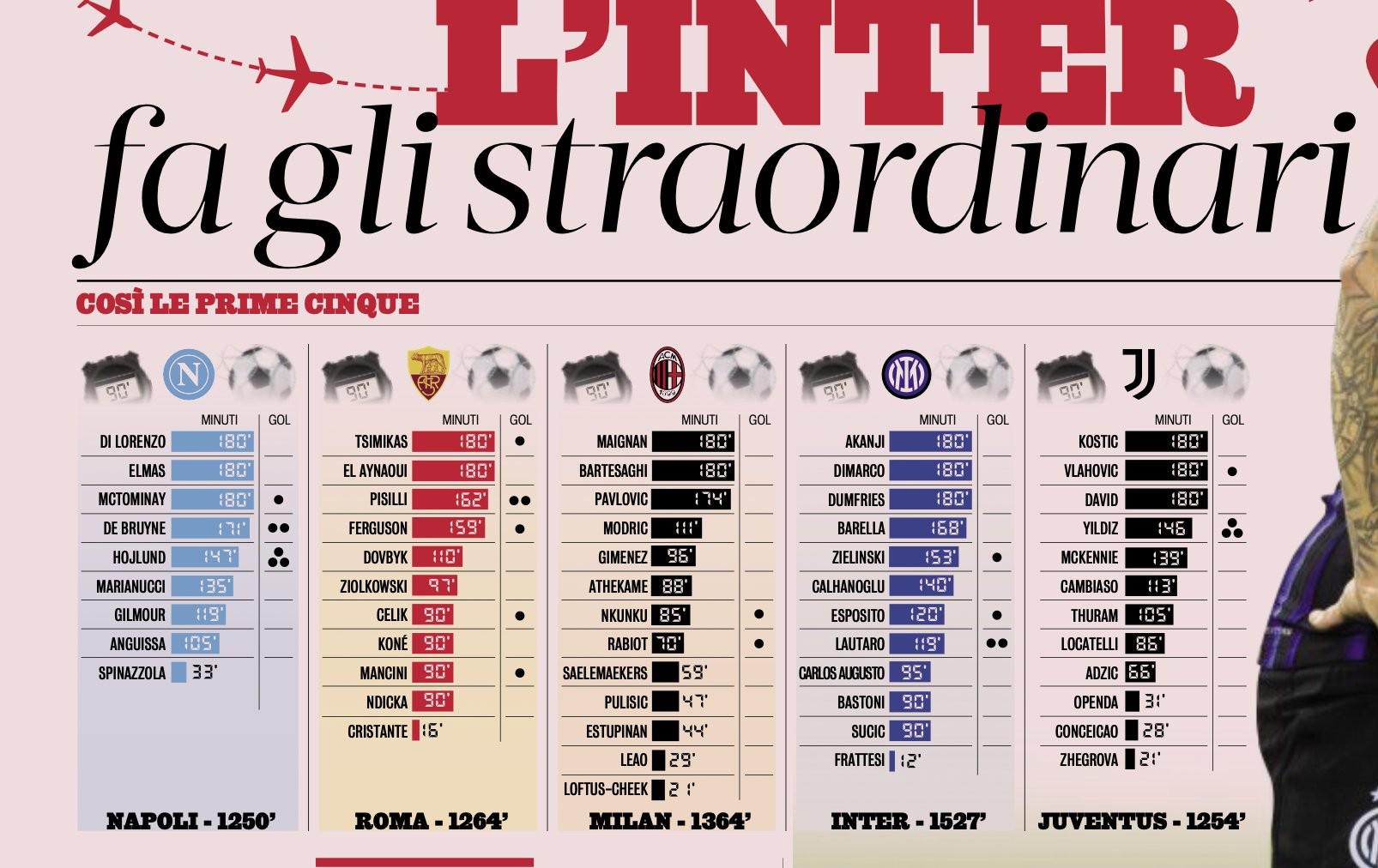 意甲五强球员国际比赛日出场时间:国米12人出场1527分钟最多